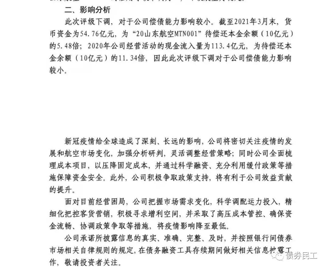 山東航空于2021年5月31日披露了上述聯(lián)合資信的評級下調(diào)報告,并于6月2日披露了評級下調(diào)公告,確認此次評級下調(diào)對公司償債能力影響較小,公司有較為充足的貨幣資金償還“20山東航空MTN001”。