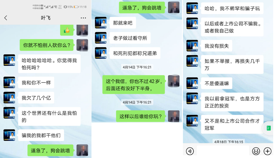 “看我最近跟葉飛的聊天就知道葉飛的性格了,只要有人得罪他就天不怕、地不怕的那種,包括光頭我跟他也沒有實(shí)質(zhì)的業(yè)務(wù)往來。我怕有一天我得罪他了,他也會(huì)這樣對我的?!痹摵糜颜f道。