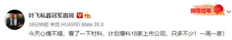 被點(diǎn)燃了小宇宙的葉飛,計(jì)劃爆料10家上市公司,包括:中源家居、東方時(shí)尚、今創(chuàng)集團(tuán)、維諾信、昊志機(jī)電、華鈺礦業(yè)、祥鑫科技、隆基機(jī)械、法蘭泰克、眾應(yīng)互聯(lián)(ST眾應(yīng))。