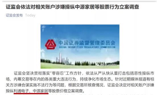 此外,還有3家券商也被卷入其中,分別是民生證券、恒泰證券、天風(fēng)證券。周五(5月14日)證監(jiān)會(huì)表示已啟動(dòng)核查程序,周日(5月16日)證監(jiān)會(huì)進(jìn)一步發(fā)聲,依法對相關(guān)賬戶涉嫌操縱中源家居等股票行為立案調(diào)查。