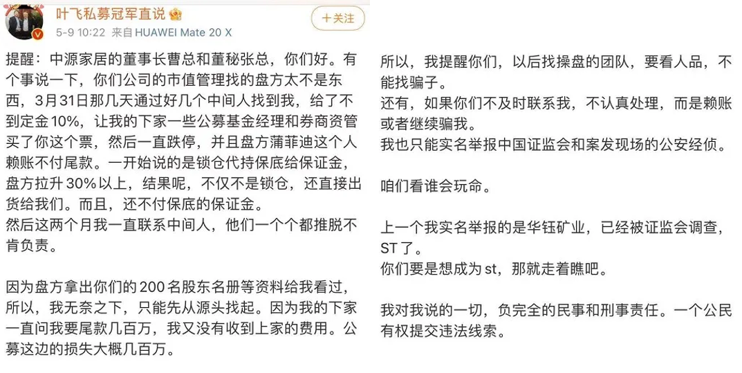 其實(shí)早在一個(gè)月前,葉飛在微博中就曾表示:“下一個(gè)我要實(shí)名舉報(bào)中源家居,提前給大家預(yù)告一下?!?這是葉飛首次公開提到中源家居(603709.SH),并稱會(huì)舉報(bào)更多欺騙他、讓他損失過的上市公司。