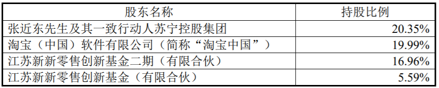 收購完成后,蘇寧易購的前四大股東為:張近東及其一致行動人持有20.35%股份,淘寶中國持有19.99%股份,新新零售基金二期為第三大股東,持有16.96%股份,而新新零售基金一期持有5.59%股份。