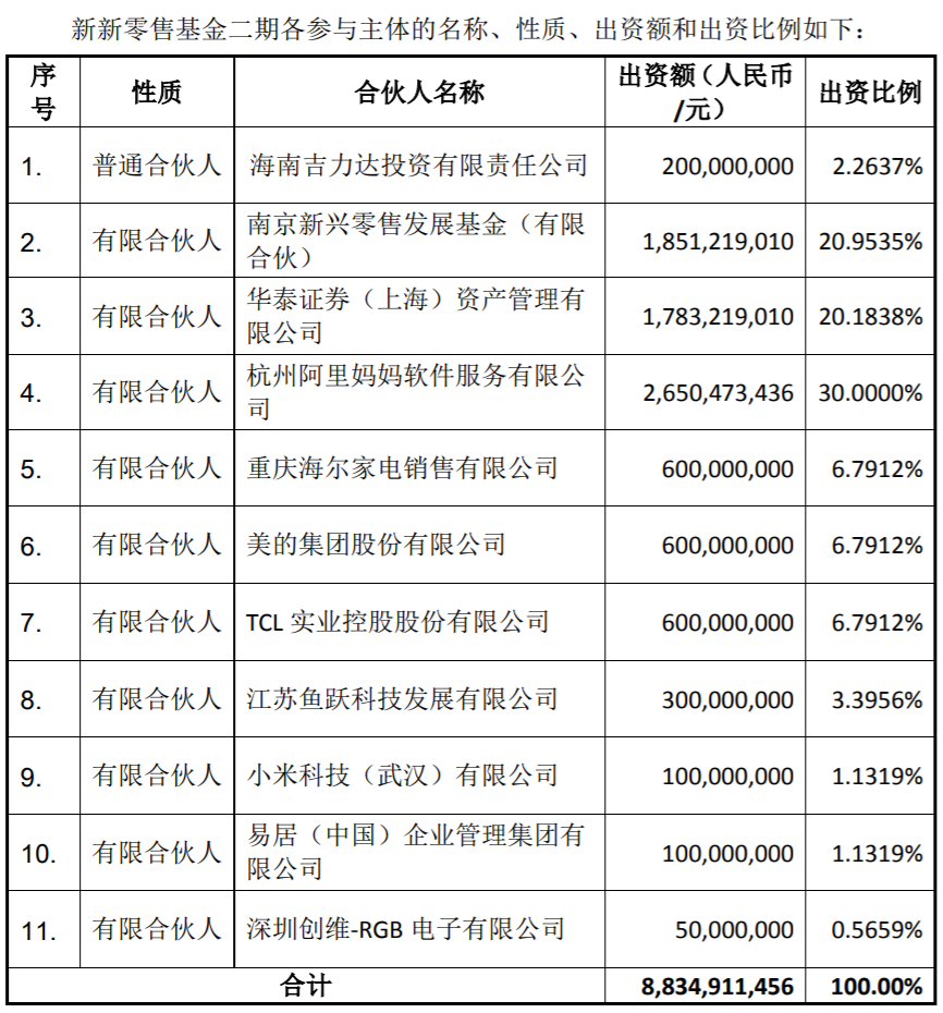 根據披露的數據,新新零售基金由南京市國資和阿里領銜美的、海爾、小米、TCL、創維等產業投資人組成,總共認繳出資額88.35億元,其中LP(有限合伙人10家),GP(普通合伙人)1家。