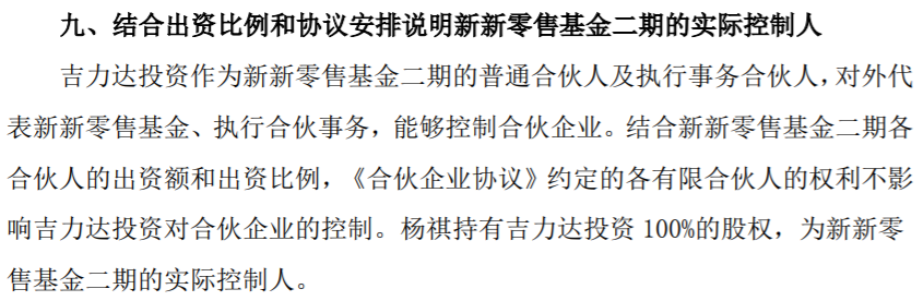 所以新新零售基金二期的控制人為海南吉力達,自然人楊祺持有海南吉力達100%股權,因此,楊祺為新新零售基金二期的實際控制人。