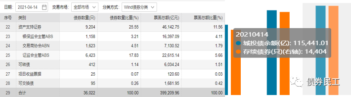 從概念上來講,地方政府融資平臺和城投公司基本上市可以劃等號的。城投債已經是信用債券非常重要的一個組成部分。根據wind資訊的信用債研究和城投債研究統計數據,截至2021年4月14日,信用債券存量金額為399,209.96億元,存續只數為36,022只;城投債存量金額為115,441.01億元,占信用債券的比例為28.92%,存續債數為14,404只,占信用債券的比例為39.99%。