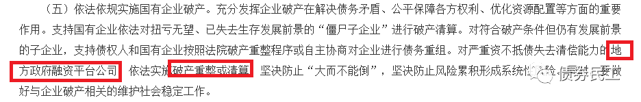 (2)對于企業債券的償債責任履行,鼓勵債務人(融資平臺公司)按照企業債券類債務有關管理政策進行債務重組或者通過企業破產等市場化方式處置。這里的企業債券概念應該是廣義上的信用債券概念,也是通過債務重組和破產方式進行化解債務問題。