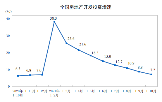 其中,10月房地產開發投資同比下降5.4%,新開工面積同比下降33%。全國房地產開發投資增速從1-2月的38.3%,一路下滑至1-10月的7.2%,增速持續收窄。