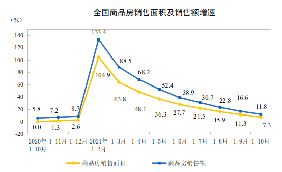 國家統計局數據顯示,今年前10個月商品房銷售面積14.3億㎡,銷售總額14.7萬億,同比分別增長7.3%和11.8%。