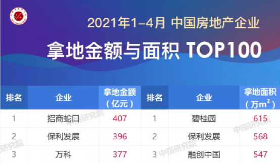 利好之下,結果就是1-4月招商蛇口拿地金額達407億元,位列房企拿地金額榜單第一。