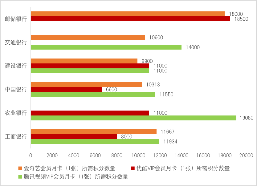 在積分兌換環(huán)節(jié),各家銀行信用卡的積分壁壘并未打破,價(jià)值分化明顯。以部分視頻類會(huì)員卡兌換權(quán)益為例,在國(guó)有六大行中,用積分全額兌換騰訊視頻VIP會(huì)員月卡、愛奇藝會(huì)員月卡、優(yōu)酷會(huì)員月卡,建設(shè)銀行兌換前兩種視頻月卡權(quán)益所需積分最少(積分含金量最高),中國(guó)銀行兌換第三種月卡權(quán)益,所需積分最少。兌換同樣的權(quán)益,對(duì)應(yīng)的每家銀行積分?jǐn)?shù)量?jī)r(jià)值存在“積分差”。