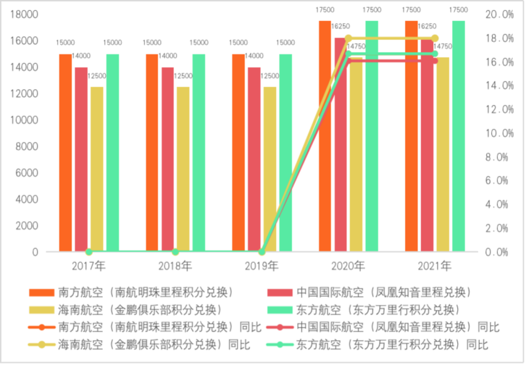 以中國(guó)銀行積分兌換航空里程為例。從2017年到2021年,中國(guó)銀行與國(guó)內(nèi)各家航空公司的里程積分兌換比例出現(xiàn)調(diào)整,積分價(jià)值下滑趨勢(shì)明顯。其中2020年中國(guó)銀行積分兌換南方航空、中國(guó)國(guó)際航空、海南航空、東方航空1航空里程所需積分?jǐn)?shù)量均出現(xiàn)超過10%的增長(zhǎng),特別是2020年中國(guó)銀行積分兌換1航空里程海南金鵬俱樂部積分所需積分?jǐn)?shù)量同比增長(zhǎng)率達(dá)到18%。