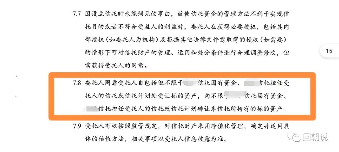 信息原文如下:“這個信托產品是定制產品,一千萬起投,他這個的底層投向在最后幾頁,每個人每期的底層投向都不一樣,只有簽協議后才能看到自己買的這個產品的實際投向,她們客戶經理跟我說這是一個全權委托單一定制的信托產品,她說合同里有隱性兌付的條款,如果投資人投完后底層出了問題她們XX信托會收購那個底層資產再重新給客戶分配新的底層資產,期限有10個月,一年兩年不等,這周發的十個月到期的,年化7%,就是不明白這種產品的風險點在哪里,我找一下她發我的隱性兌付的截圖。”