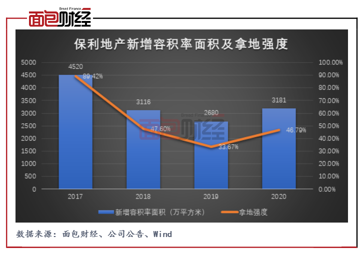 保利地產2020年在拿地方面有所發力。公司2020年拓展項目146 個,新增容積率面積3186 萬平方米,同比增長19%,土地儲備恢復至2018年水平。