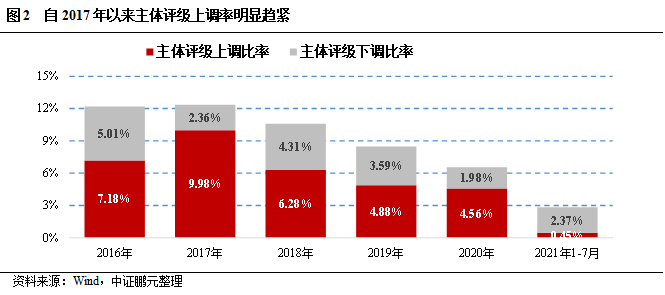 同時,我國評級機構在上調級別方面已趨于謹慎。2016-2021年級別調整率表明,自2017年以來我國發債主體的評級上調率已明顯下降,2021年截至目前更是低至0.45%(圖2)。2018-2021年的上調/下調比率也從2018年的1.46下降至2021年的0.19,整體呈下降趨勢。