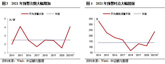 此外,我們觀察到,2018-2020年均有違約當日才進行首次級別下調的情況,造成級別斷崖式下降。其中,2018年有5家,2019年和2020年各1家,在2021年截至目前尚未發生。這也反映出,評級機構也在不斷地調整評級機制,避免這種毫無預警的斷崖式下調。二、預警次數顯著增加,預警時間大幅提前