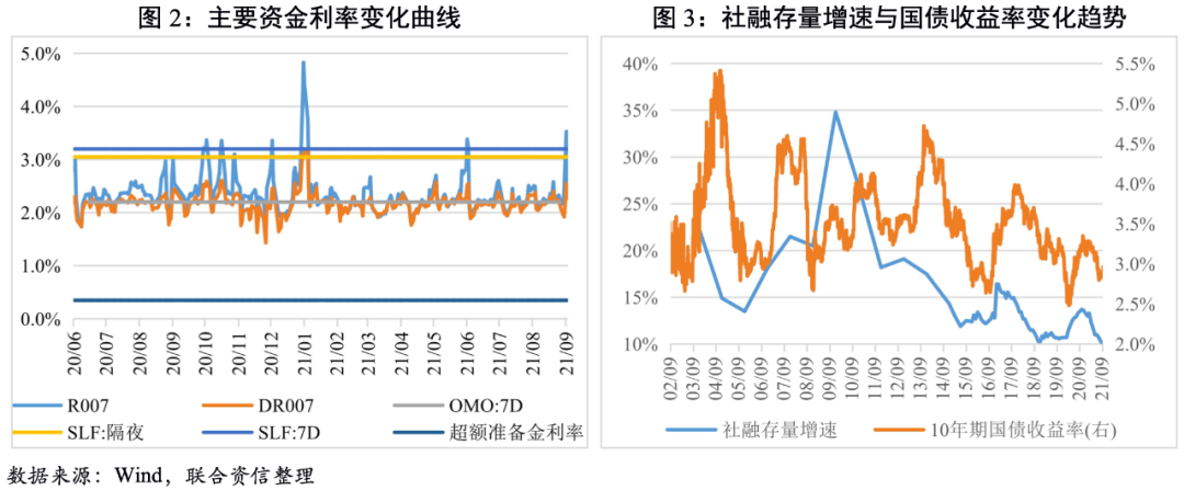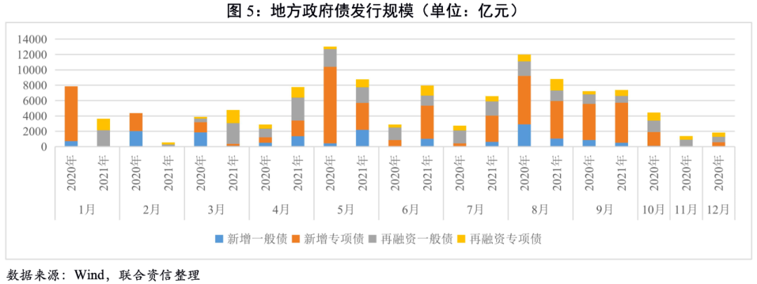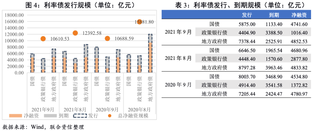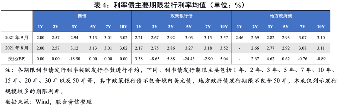 9月利率債總發行規模環比和同比雙降,其中,國債和政策銀行債發行規模較上月和上年同期均有所減少,地方政府債發行規模較上月有所減少、較上年同期小幅增加;利率債凈融資規模環比和同比雙降,其中,國債和地方政府債凈融資規模較上月和上年同期均小幅增加,政策銀行債凈融資規模較上月和上年同期均顯著減少。截至9月末,年內新增地方政府專項債發行規模2.37萬億元,發行進度為64.86%,顯著落后于2020年及2019年同期超過90%的發行進度。9月1日國常會明確提出“統籌做好跨周期調節,發揮地方政府專項債作用帶動擴大有效投資”,9月16日國家發改委新聞發布會表示“將加大宏觀政策落實力度,加快全年3.65萬億元地方政府專項債券發行和使用進度”。展望第四季度,地方政府專項債發行有望繼續加速,從而帶動地方政府債發行規模增加。
