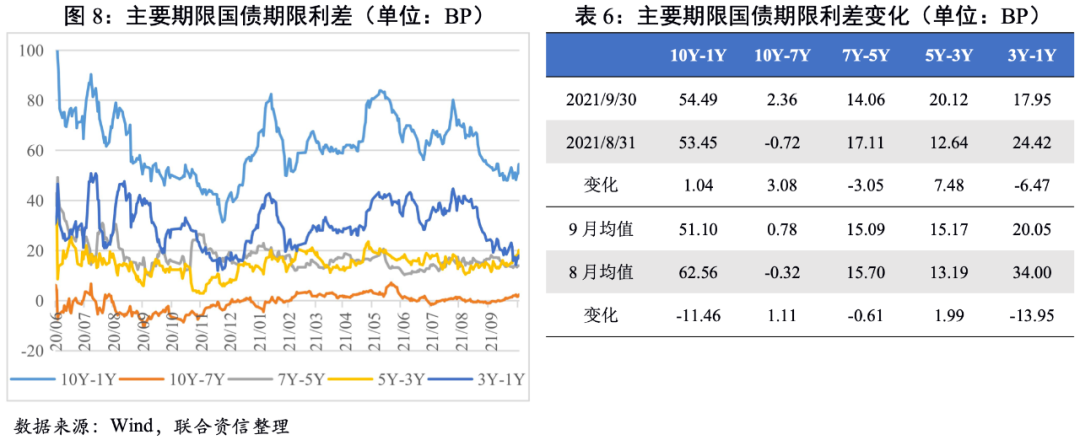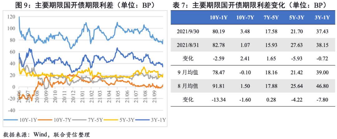 中短期期限利差大多收窄。從期限利差均值來看,國債10Y-7Y和5Y-3Y期限利差小幅走闊,其余主要期限利差均收窄;國開債除7Y-5Y期限利差小幅走闊外,其余主要期限利差均收窄。整體看,9月國債和國開債收益率曲線進一步走平,主要是由于3Y-1Y期限利差顯著收窄,這在一定程度上反映出市場對短期經濟下行壓力的擔憂繼續加深。