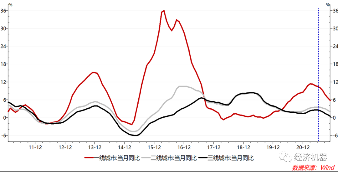 • 房地產方面,房地產銷售面積當月同比增速從6月底的7.5%,大幅下降至11月份的-14%,房地產行業幾乎“一夜入冬”。房地產下滑有周期性原因,2015-2020年,房地產行業呈現復蘇和分化走勢,行業自身存在調整性需求。2021年下半年以來,供需兩端多種因素疊加下,房地產行業出現了同步的下行(圖1)。