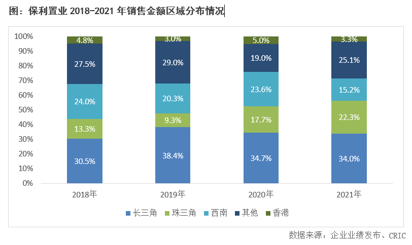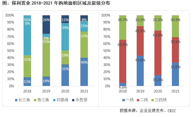 在城市能級方面,保利置業(yè)近兩年加大在三四線城市的布局,占比自2019年以來連年攀升,2021年占比達(dá)到30.9%,同比增長9.4個百分點,同時也加大在一線城市的布局,2021年一線城市的占比達(dá)到33.6%,同比上升18.1個百分點。而在區(qū)域布局方面,保利置業(yè)于長三角和珠三角區(qū)域拿地的建面占比最高,分別達(dá)到40%和37%,占比分別同比增長了9個百分點和18個百分點。