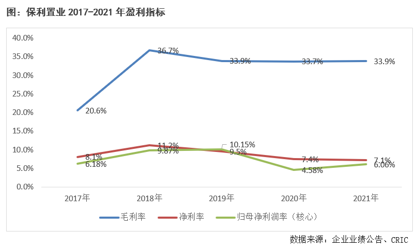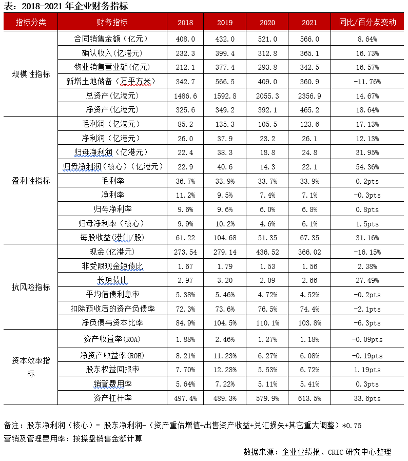 【營收未恢復(fù)疫情前水平,凈利率仍有改善空間】2021年營業(yè)收入穩(wěn)步增長,同比增加16.73%至356.13億港元,仍低于2019年的水平。從內(nèi)地營業(yè)收入來看,2021年保利置業(yè)內(nèi)地營業(yè)收入同比增長了12%,也較2019年的水平增長了8%,內(nèi)地結(jié)轉(zhuǎn)得到穩(wěn)定增長。凈利率7.1%,歸母核心凈利率6.1%,均低于行業(yè)平均,未來隨著低毛利率項目的逐步結(jié)轉(zhuǎn),其盈利率水平受到的壓力或?qū)⒏蟆?/p>