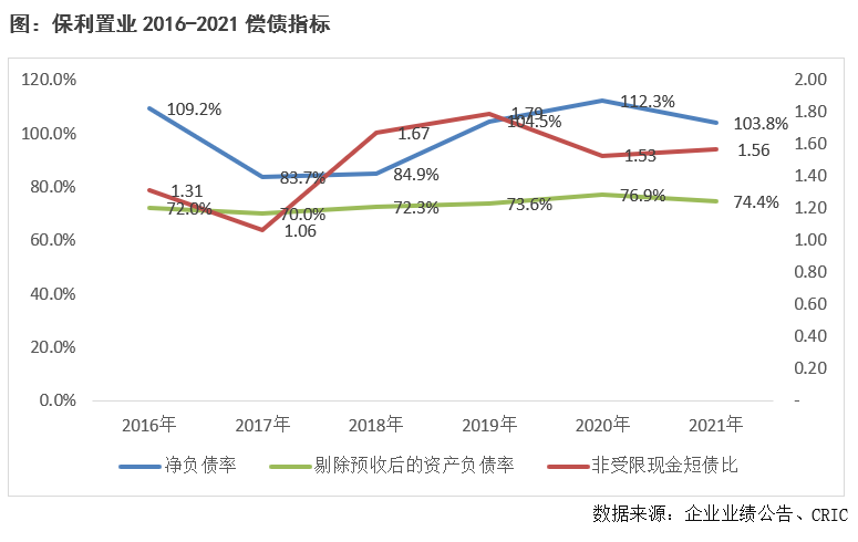 債務(wù)結(jié)構(gòu)的改善也助力企業(yè)杠桿水平的降低,2021年末凈負(fù)債率同比下降6.3個百分點至103.83%。剔除預(yù)收后的資產(chǎn)負(fù)債率也同比下降2.1個百分點至74.4%。整體來看,2021年末保利置業(yè)三條紅線指標(biāo)雖有所改善,但仍觸及兩條紅線,未來仍需進(jìn)一步加強。