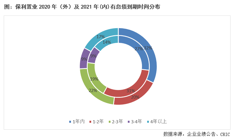 2021年末,保利置業(yè)持有現(xiàn)金較同比下降16.15%至366.02億港元,非受限現(xiàn)金短債比1.56,而2020年為1.53,現(xiàn)金短債比進(jìn)一步改善,短期償債壓力不大。而從債務(wù)期限來看,保利置業(yè)短債占比下降5個百分點至27%,債務(wù)結(jié)構(gòu)得到改善。