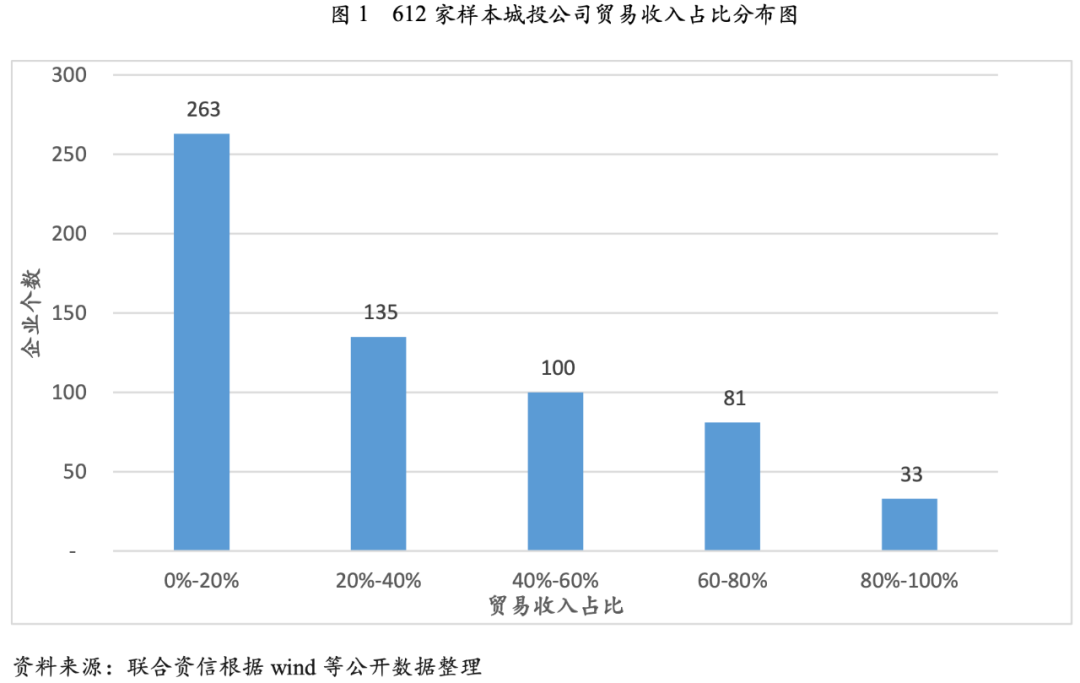 聯合資信以發債城投公司公布的2020年年報作為基礎,按照主營業務中含有“貿易”、“產品”和“商品”三個關鍵詞作為篩選標準,共篩選出612家涉及貿易的城投發債平臺。