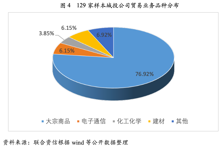 129家城投平臺樣本中主要涉及貿易品種為大宗貿易,其次為電子通信和建材,其中大宗貿易或面臨較大價格波動風險,電子通信業務已爆出相關風險事件。