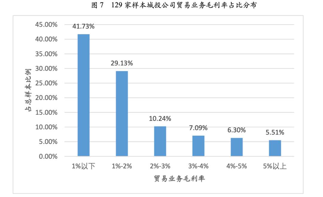 貿易業務毛利率方面,129家城投公司中,41.73%的城投公司貿易業務毛利率不足1%,貿易業務毛利率超過5%的僅占樣本總量的5.51%,城投公司貿易業務毛利率普遍較低。