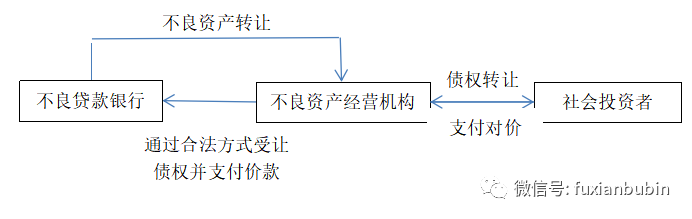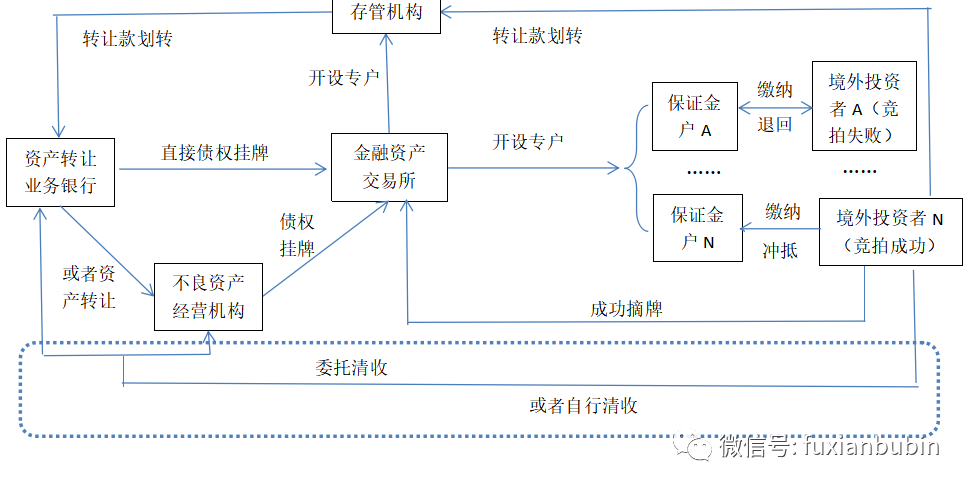 在這一模式中,不良資產經營機構作為一級市場和二級市場的紐帶,在一級市場的收購過程中,不良貸款出讓銀行應依照法律法規規定要求,通過公開拍賣、邀標競價等公開方式對外出讓不良債權,不良資產經營機構與投資者簽署委托競買協議等法律文件,并在收到投資者支付的保證金后,參與金融機構的公開拍賣、邀標競價,并受讓金融機構出讓的批量不良債權。在競得不良資產后,不良資產經營機構向投資者收取債權尾款,并向其轉讓競得的債權。