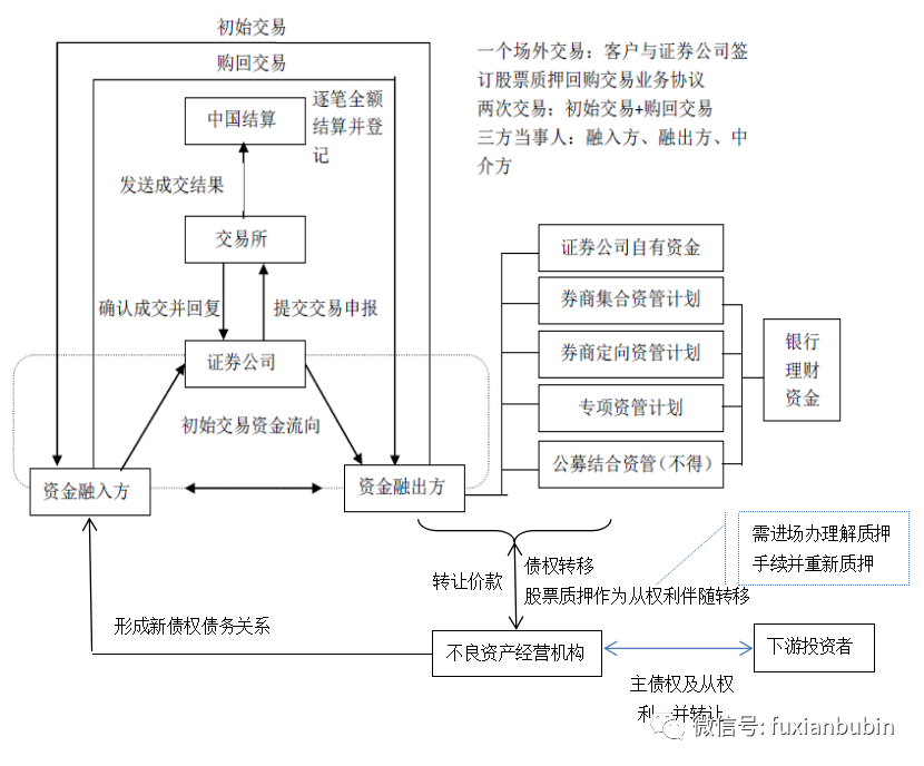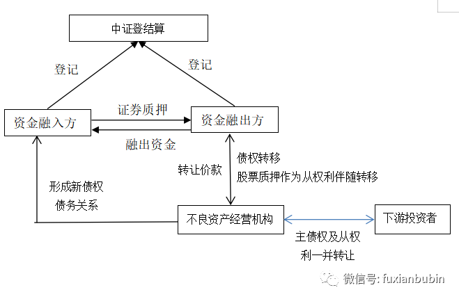場外質押系指債務人或第三人以其持有的股票進行質押擔保,為其向債權人的借款進行擔保的交易行為。場外質押并沒有標準化的業務模式,實踐過程中開展此類型業務的模式多種多樣。在不良資產收購轉讓業務中,依然是不良資產經營機構在從資金融出方手中收購債權過程中,將質押的股票作為從權利進行轉移,在通過轉讓方式找到合適下游投資者的過程: