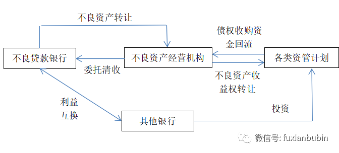 在2014年以來,銀行類金融機構嘗試通過同業交易的方式掩蓋不良資產,即銀行之間相互代持、安排顯性或隱性回購條款轉移至表外等方式轉移不良貸款,該模式已經被《關于規范信貸資產轉讓及信貸資產類理財業務有關事項的通知》(銀監發[2009]113號)、《關于進一步規范銀行業金融機構信貸資產轉讓業務的通知》(銀監發[2010]102號)等文件所確立的“真實性、整體性和潔凈性”轉讓三原則所否定。同時,《關于規范金融機構同業業務的通知》(銀發[2014]127號)繼續縮小了進行違規操作的可能性。業務受限后,銀行類金融機構開始嘗試通過投資信托計劃、各類資管計劃產品、私募基金的方式對不良資產收益權進行交易,其交易結構基本如下圖示: