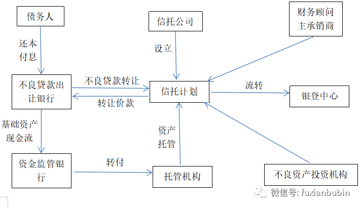 信貸資產收益權轉讓的政策依據是《中國銀監會辦公廳關于規范銀行業金融機構信貸資產收益權轉讓業務的通知》(銀監辦發[2016]82號)及《信貸資產收益權轉讓業務規則(試行)》(銀登字 (2016)16號),不良貸款收益權作為信貸資產收益權的下位概念,依然要遵循這一規定,由此此類業務的具體轉讓模式為:合格機構投資者資金(信貸資產銀行的理財資金除外),投資于信托公司設立的信托計劃,信托計劃受讓銀行不良信貸資產收益權,同時出讓方銀行與信托公司以貸款管理協議形式確定貸款管理人,明確信貸資產的日常管理職責和清收職能。信托計劃到期時,對尚未完全償付的信貸資產,可由貸款管理人通過市場化方式,規范、透明地進行處置。