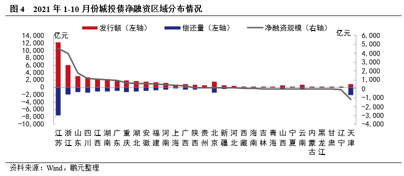 10月份浙江、福建凈融資規模較大,凈償還的省份增加。10月份,浙江、福建凈融資規模分別為111.16億元、66.10億元,位居前兩位;凈償還城市較上月增加5個至15個,天津凈償還130.78 億元、江蘇凈償還93.07 億元,湖北、云南、甘肅的凈償還規模在30-50億元。