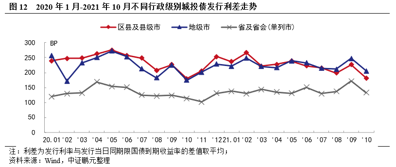 從各級別城投平臺平均發行利差來看,2021年10月份發行利差均下行。區縣級、地市級、省級平臺的平均利差分別為182 BP、206 BP、133 BP。由于發債主體整體資質上升以及債券期限縮短等因素,各級平臺的發行利差均下降。整體來看,近期城投債利差水平基本維持穩定,未來利差仍將圍繞中樞波動。