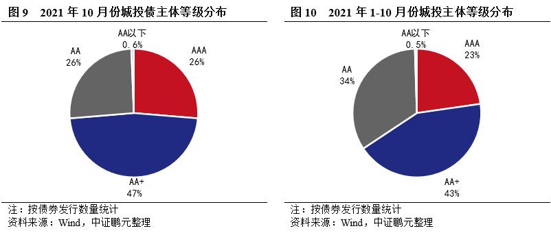 主體評級中樞上升,AAA級主體占比上升較大。10月份城投債主體評級AA+級及以上級別合計占比73.7%,較上月上升11.0個百分點,其中AAA級主體占比較上月上升6.7個百分點。