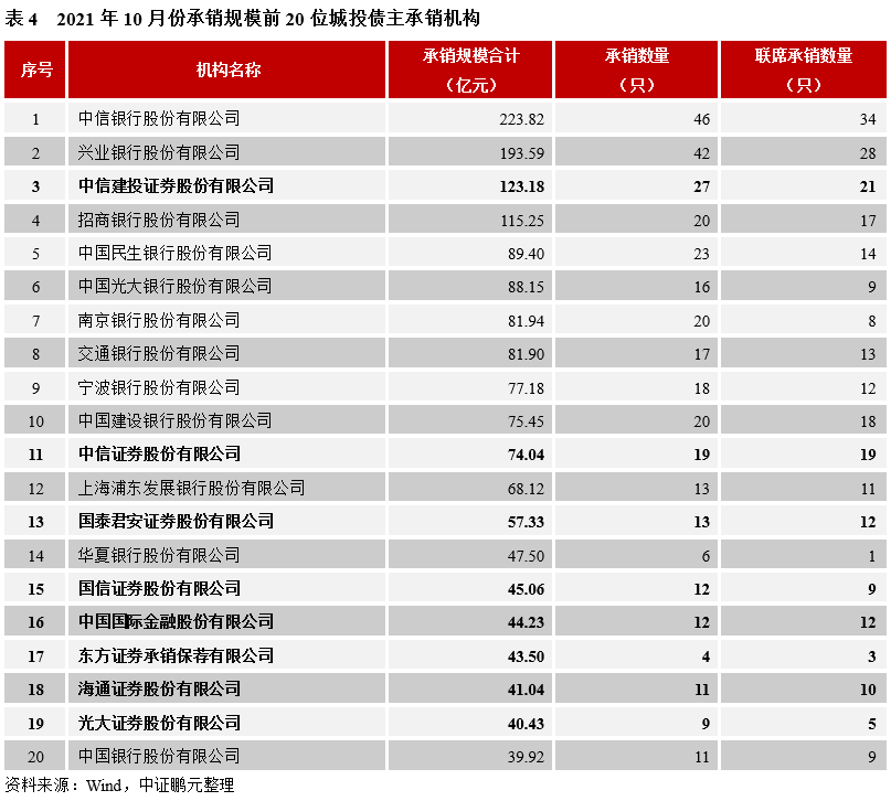 2021年10月份,共有90家機構參與了城投債的承銷工作,其中券商56家,銀行機構34家。就承銷規模而言,中信銀行以223.82 億元的承銷規模位居第一,位居首位;興業銀行以193.59億元的承銷規模位居第二,中信證券、招商銀行、民生銀行的承銷規模分別位于第三至五位。就券商機構而言,券商機構合計承銷918.03億元,占總發行額的38%,以中信建投、中信證券、國泰君安的承銷規模較大,分別位于第3、11、13位。