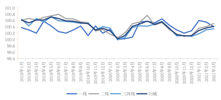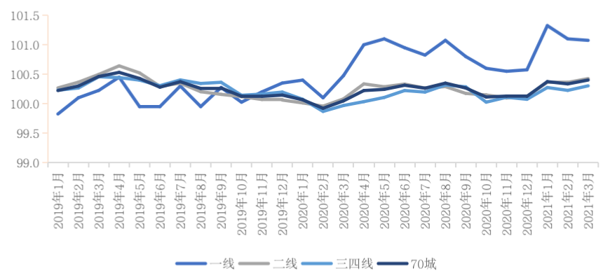 圖:2019年1月-2021年3月70城及各能級城市新建商品住宅價格指數環(huán)比走勢