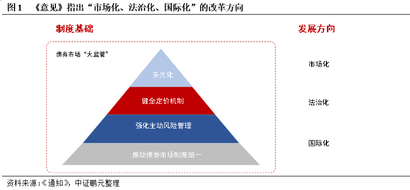 法律法規(guī)是實現(xiàn)市場有序發(fā)展的基礎,由于我國債券市場發(fā)展時間較短,相關制度有待完善。隨著信用風險的逐步顯露和債券市場的對外開放需求,推動法治統(tǒng)一成為債券市場健康發(fā)展的基礎。根據(jù)《意見》,債券市場的法律安排將按照“分類趨同、規(guī)則統(tǒng)一”的原則進行,即根據(jù)發(fā)行方式,分類監(jiān)管。第一,統(tǒng)一法律基礎。《意見》頒布前,非金融企業(yè)債務融資工具參照《人民銀行法》進行管理,此次明確《公司法》和《證券法》是公司信用類債券市場的基礎法律,實現(xiàn)了全市場公司信用類債券法律標準的統(tǒng)一。第二,統(tǒng)一司法處置標準。《意見》指出,在民商事審判工作中,對企業(yè)債券、非金融企業(yè)債務融資工具、公司債券適用相同的法律標準,第三,明確統(tǒng)一執(zhí)法權,由國務院證券監(jiān)督管理機構依法對違法違規(guī)行為進行認定和處罰。第四,將逐步統(tǒng)一債券市場各類制度和執(zhí)行標準,包括債券發(fā)行交易、信息披露、信用評級、投資者適當性、風險管理等。其中,明確對非公開發(fā)行公司信用類債券的各項制度進行統(tǒng)一規(guī)范,以降低信息不對稱帶來的投資者利益損失。