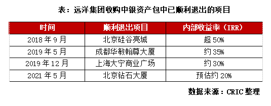 此舉也可以幫助遠洋集團降低重資產持有比例,在繼續保持對項目操盤和管理權的情況下,同時實現現金回流,為后續拿地及收并購創造更有利條件。且依托專業化管理,遠洋集團還將持續收獲資產管理收益。另外10月12日遠洋資本收購新加坡大信商用信托管理有限公司70%股份,正式成為管理公司控股股東,這筆收購將貫通不動產私募基金和境外公募REITs兩個平臺,實現“投、融、管、退”全鏈條閉環,為其商辦類重資產資本化退出做鋪墊。此前,遠洋已經通過資本運營,成功退出了多個商業寫字樓項目,如2017年7月遠洋通過境外股權交易方式收購的中銀資產包6個項目中,北京硅谷亮城、成都華敏翰尊大廈、上海大寧商業廣場、北京鉆石大廈4個項目已經實現順利退出,且獲得較高的內部收益率。