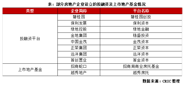目前已有多家房企擁有自身的投融平臺,如金地集團的穩盛投資、中國金茂的金茂資本、首創置業的首金資本等,這些資本平臺多圍繞地產主業,開展股權、債權、不動產投資及其他房地產上下游產業鏈。隨著發展有些平臺后來擴大規模,逐漸轉換角色,成長為私募基金平臺,成為投融管退的操作者,這類平臺在基金設立方面多半會引入外部戰投,借力布局項目。另外除了投融資平臺,也有直接設立地產基金進入資本市場,如越秀房托、招商局商業房托基金。