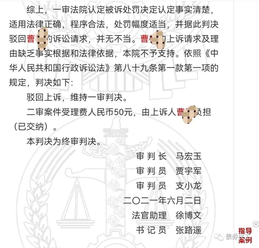 五洋債作為首單因債券欺詐發行被處罰的債券,對于信用債券市場的影響可謂深遠。而五洋債涉及的個人處罰問題最近也有了新的進展。曹某時任德邦證券債券承做部門負責人、項目承攬人。2021年6月9日,五洋債項目承攬人曹某訴訟證監會要求撤銷5年證券市場禁入措施案件迎來了終審判決,北京市高級人民法院法院駁回了曹某的上訴請求,維持對其5年證券市場禁入措施。