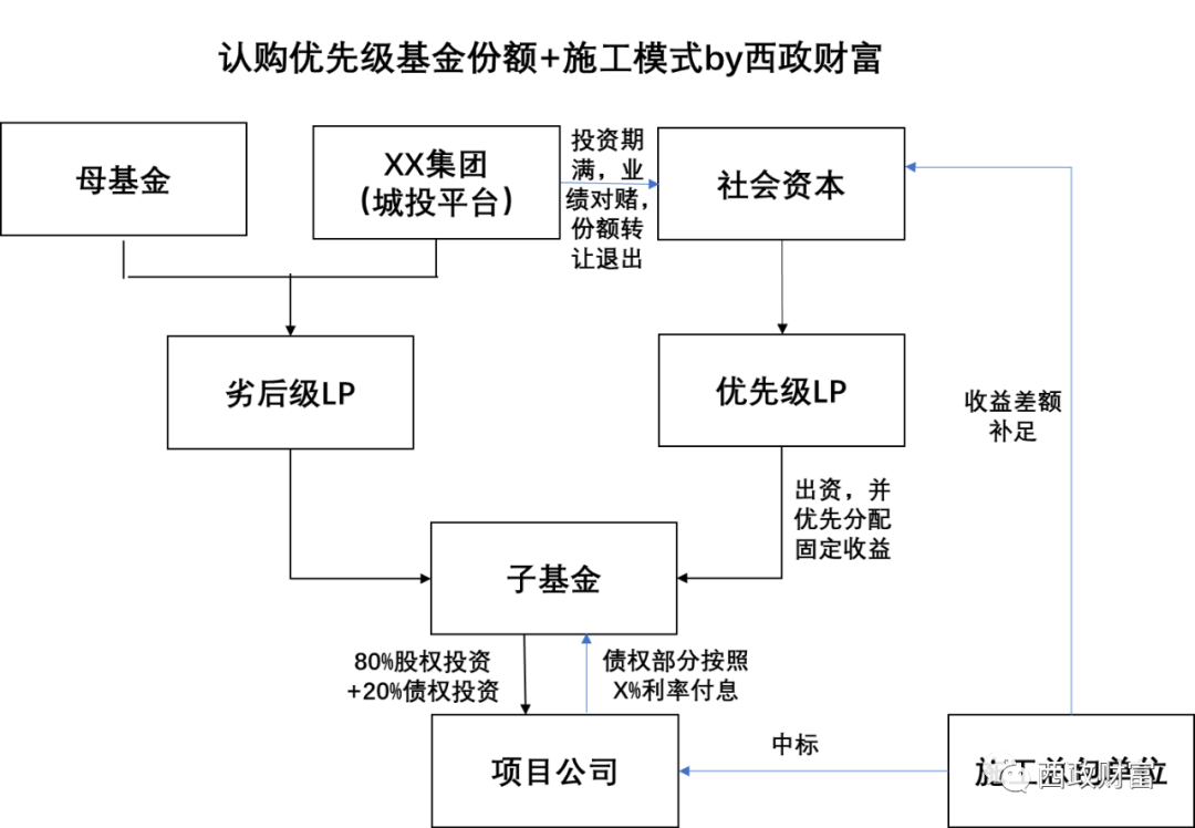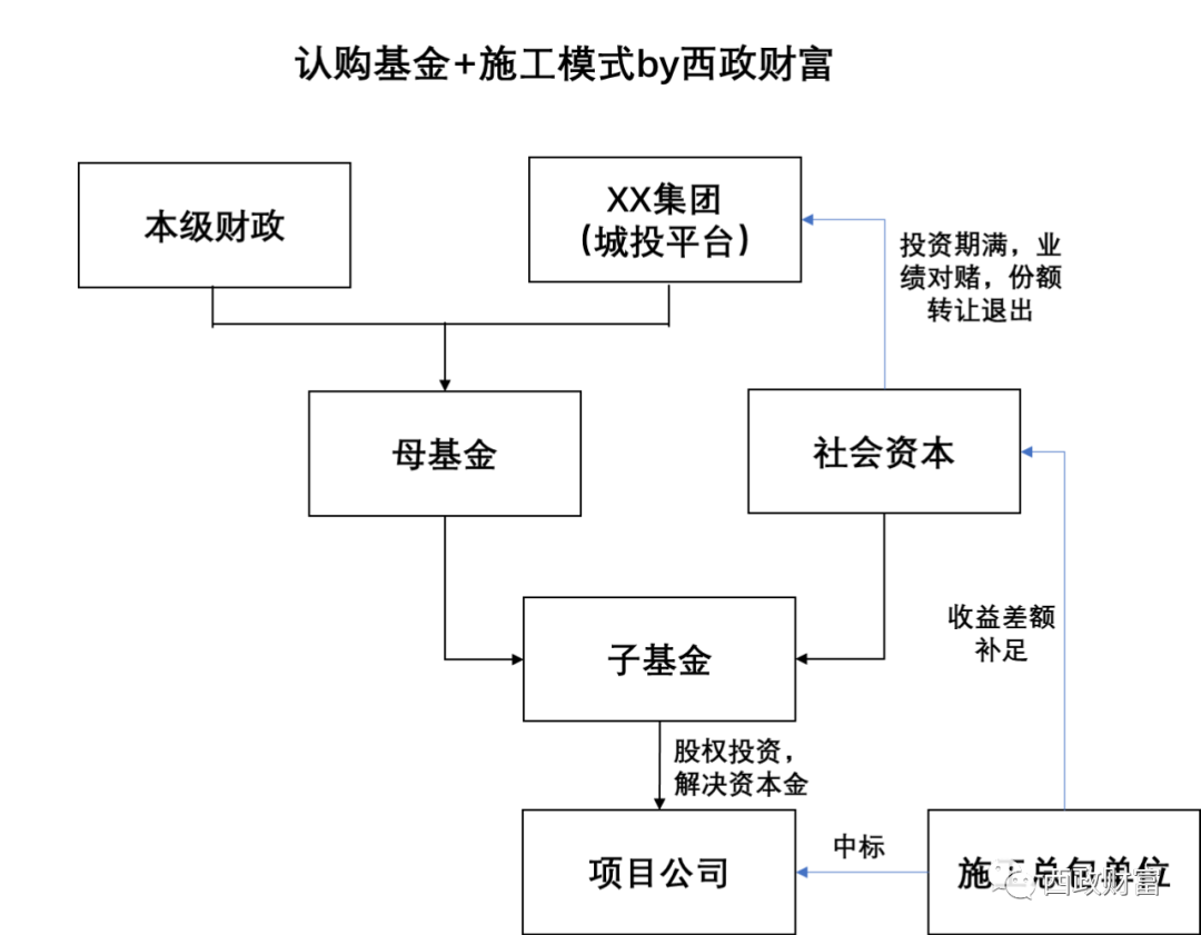 (1)施工單位或其引入的資金作為社會資本方(下稱“合作方”)按照項目總投資一定比例(如10%)認繳XX投資基金(母基金)的項目專項子基金。項目專項子基金以股權形式向項目公司進行投資,為項目提供資本金。