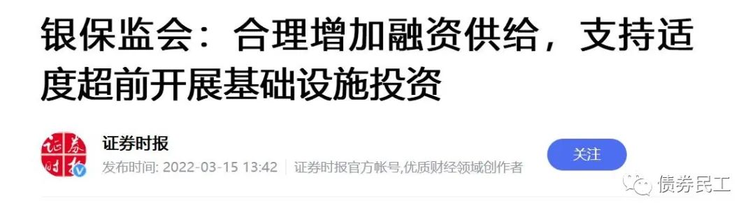 根據(jù)證券時(shí)報(bào)2022年3月15日的報(bào)道,“銀保監(jiān)會(huì)支持支持適度超前開(kāi)展基礎(chǔ)設(shè)施投資”。