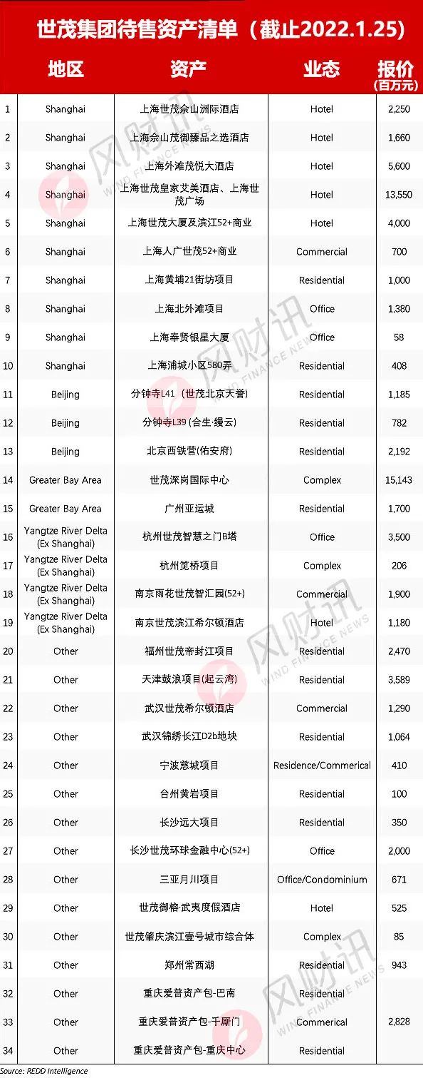 風(fēng)財(cái)訊從世茂待售資產(chǎn)包看到,34個(gè)重點(diǎn)項(xiàng)目,以綜合體商辦為主。上海世茂廣場(chǎng)(含皇家艾美酒店)和世茂深港國(guó)際中心兩個(gè)項(xiàng)目報(bào)價(jià)都超過百億,分別為135.55億和151.43億元;