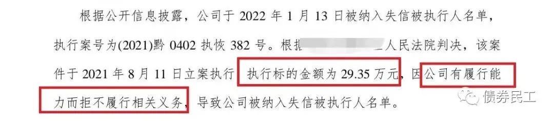 債券民工曾在某些城投公司的被執(zhí)行金額越來越低了一文中感慨,城投公司的被執(zhí)行金額越來越低,沒想到的是,某些城投公司失信被執(zhí)行人的被執(zhí)行金額也越來越低了。根據(jù)評(píng)級(jí)公司于2022年1月20日披露的公告,某城投公司因?yàn)閳?zhí)行標(biāo)的金額為29.35萬元的案件有履行能力而拒不履行相關(guān)義務(wù),于2022年1月13日被納入失信被執(zhí)行人名單。