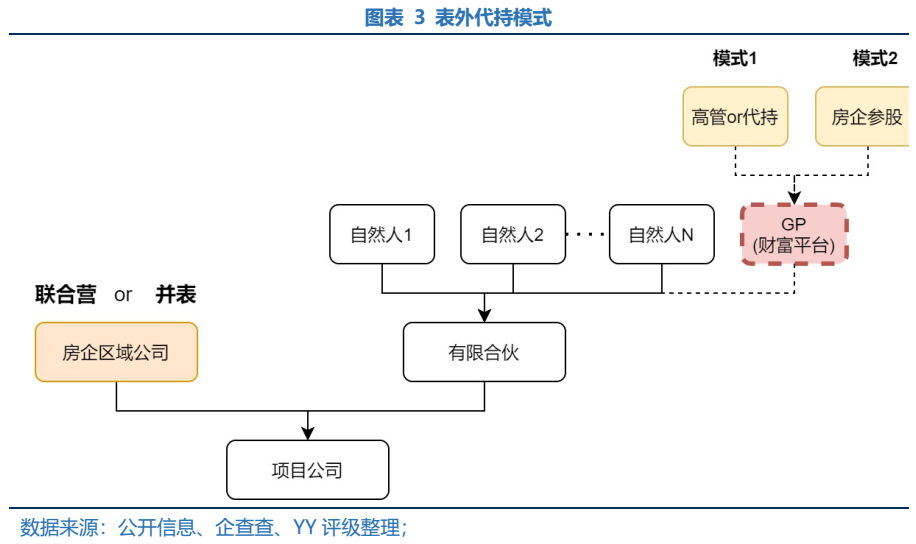 取決于理財產品參股的項目性質,則自融的表外負債或藏于“子公司明股實債”或“聯合營表外負債”,而財富平臺多利用GP身份持少股并由企業高管代持,僅少部分房企的財富平臺為企業逕直持股。