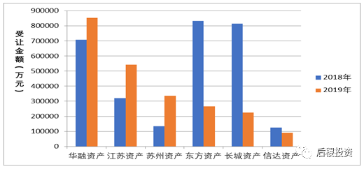 相比2018年,東方資產(chǎn)和長城資產(chǎn)受讓銀行資產(chǎn)總額下滑顯著,跌出前二。華融資產(chǎn)受讓85億資產(chǎn)位列首席,江蘇資產(chǎn)、蘇州資產(chǎn)緊隨其后,位于二三位。