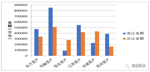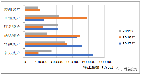 從上圖所知,華融資產(chǎn)、長城資產(chǎn)、江蘇資產(chǎn)位列前三甲,且出讓金額均超過40億元;相比2018年,信達資產(chǎn)和東方資產(chǎn)情況截然相反,分別減幅和增幅近半。成立于2016年5月底的蘇州資產(chǎn),17年沒有出讓記錄,這兩年出讓金額穩(wěn)定在20億左右。
