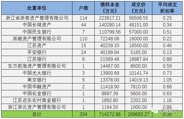 從阿里拍賣平臺中篩選出江蘇地區(qū)債權(quán)(超過1000萬)成交記錄,總成交戶數(shù)334戶,成交債權(quán)總本金超71.4億,總成交價26.97億元。具體情況如下表所示: